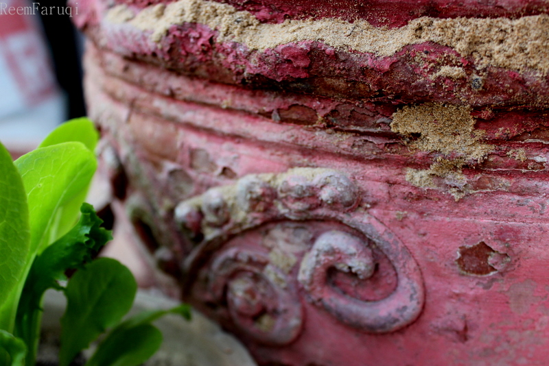Supposedly-mundane crumbly pot from Nana’s outdoor garden on the verandah. This one too contains history in it. Nana grew the lettuce on her own. I love the arches in this pot and the brown dusty Karachi sand wedged in the cracks.