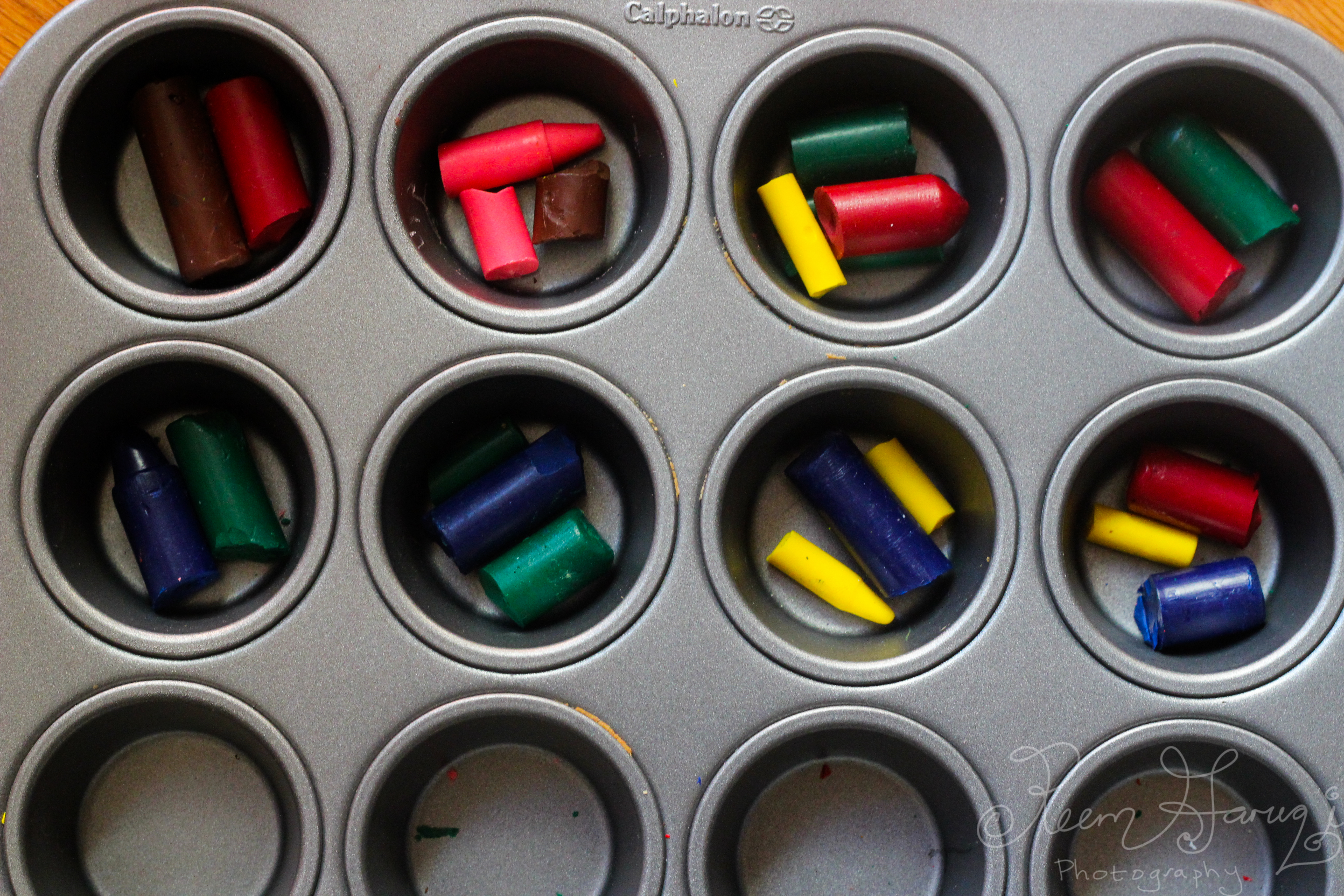 You start out with a bunch of crayons. Z had some jumbo ones that I didn’t want to use – So I used the left over forlorn crayons that were already broken or duplicated. California Pizza Kitchen and IHOP give out free crayons when you visit so these are good to save and use! Put whatever you have in a cupcake tray. I only had enough for 2 rows.