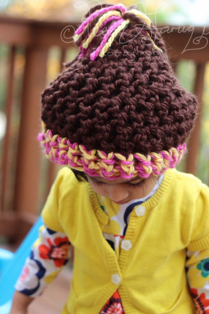 so her pony tails are smushed in this photo! That’s why the hat is shaped weird!