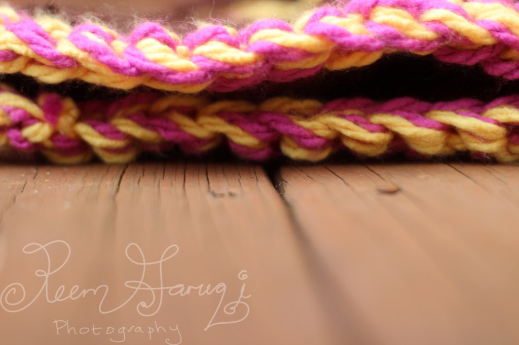 I thought mango colored yarn with hot pink yarn is such a fun combo. This was my first time crocheting with double yarn on the hook. Was like a mango hot pink braid!