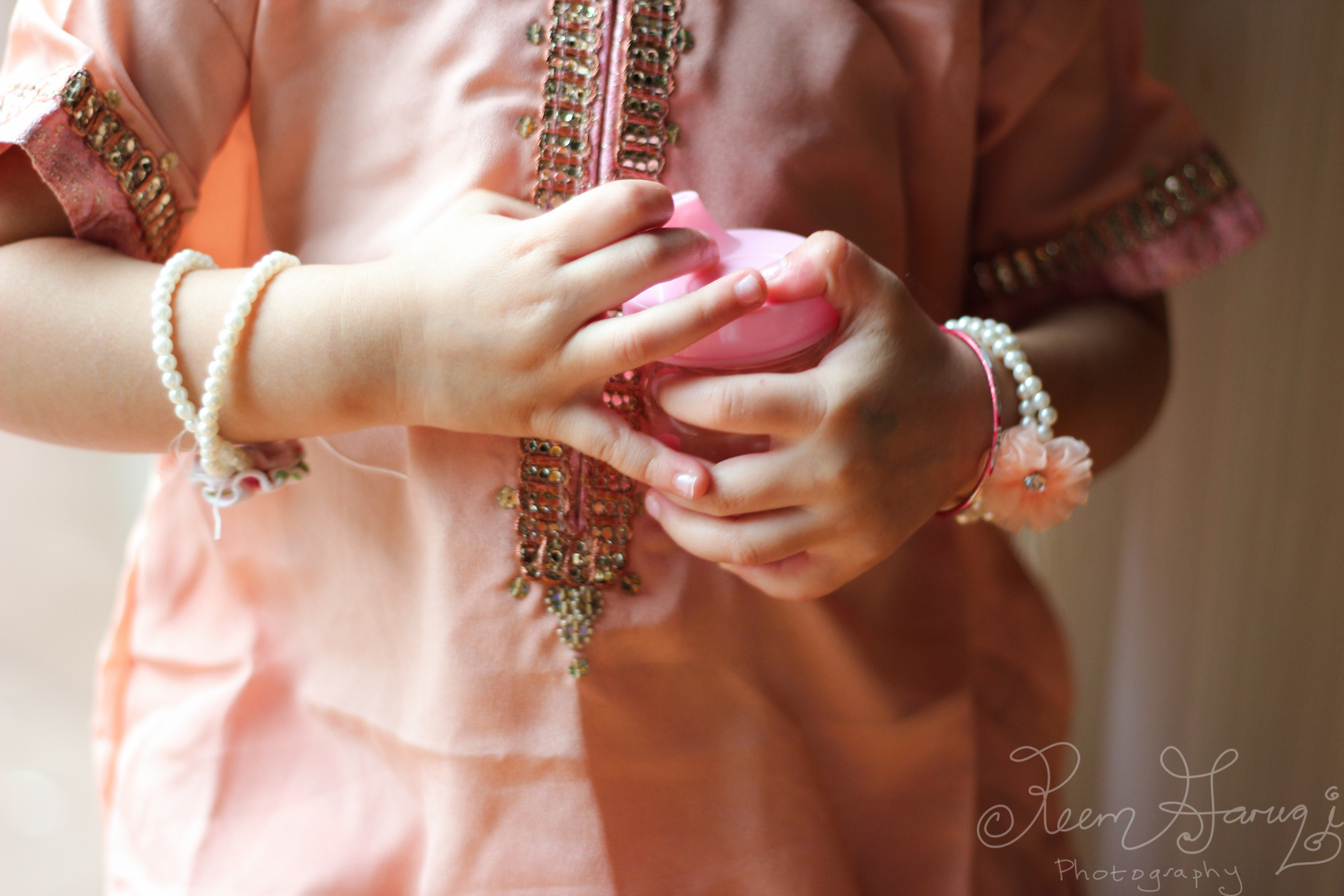My grandmother Nana gives the best gifts ~some v.practical and easy to use, and some fancy and fun that you can’t wait to wear and treasure. This package fell in the ‘fancy and fun’ category ~ a gorgeous faint pink gharara for Z. We were supposed to go to a dholki, but didn’t end up going, as alas, Z fell sick with a fever and cough a day before the event, hence the title ‘hopeful hands.’ At least I got some photos of her trying her gharara the day before!
