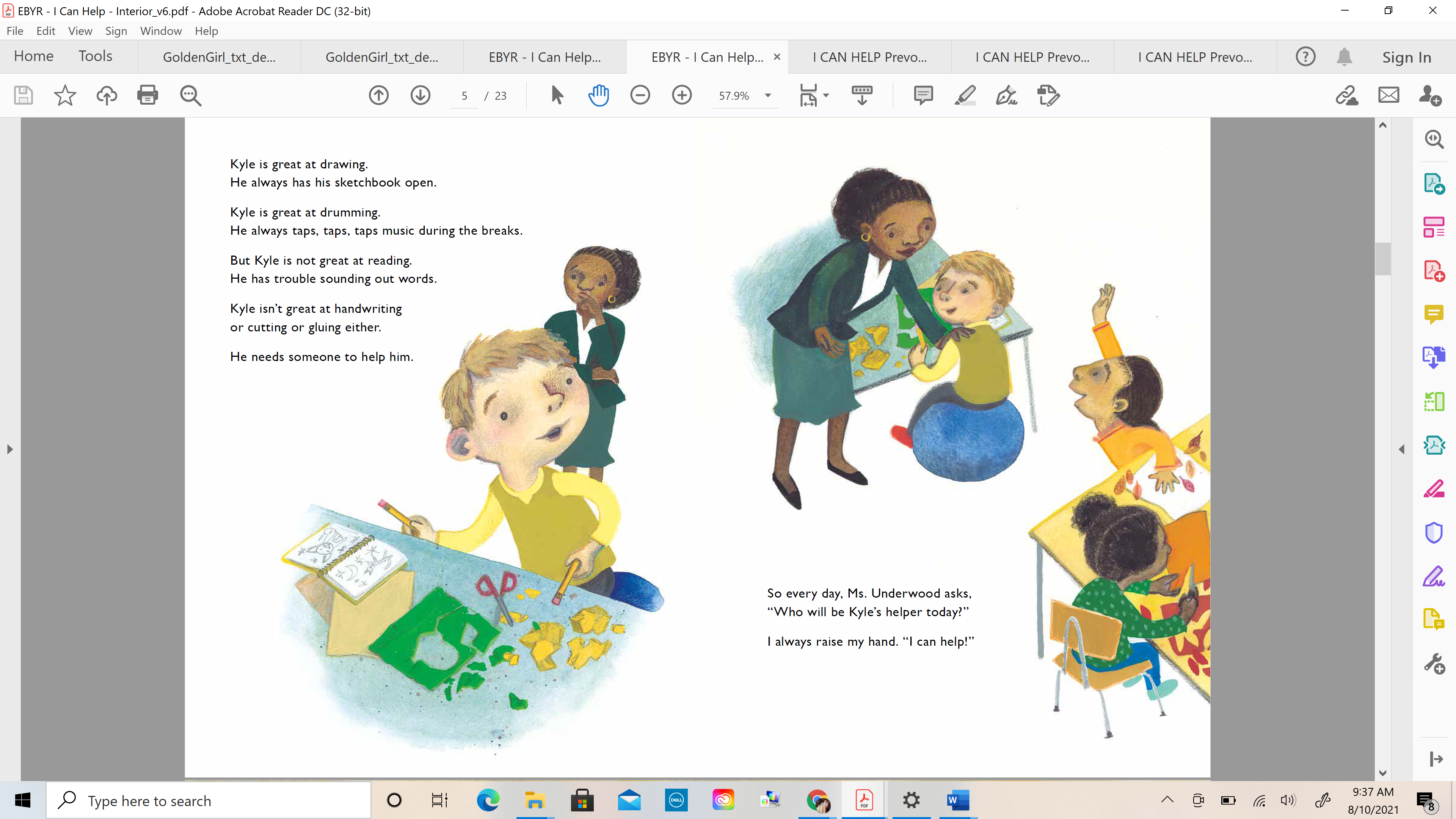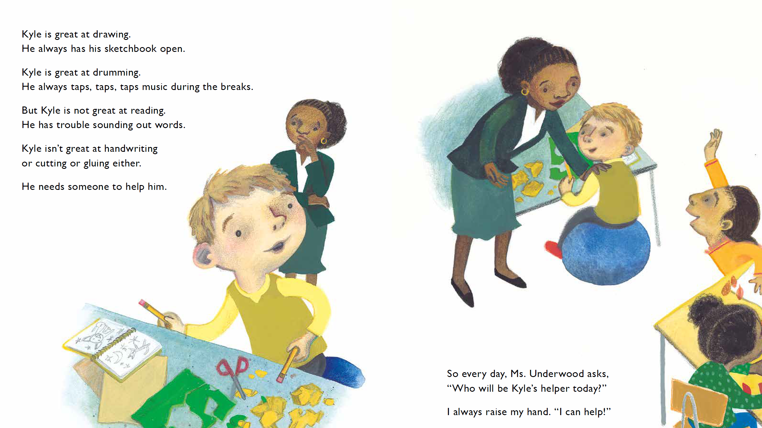 6. It’s genius! I loved your Illustration Note where you poignantly share how you were teased as a child for having Juvenile Rheumatoid Arthritis. I CAN HELP is a more serious story inspired by an experience of mine, and the other books you’ve worked on seem to have more lighter and joyful themes. Why did you take this project on?
