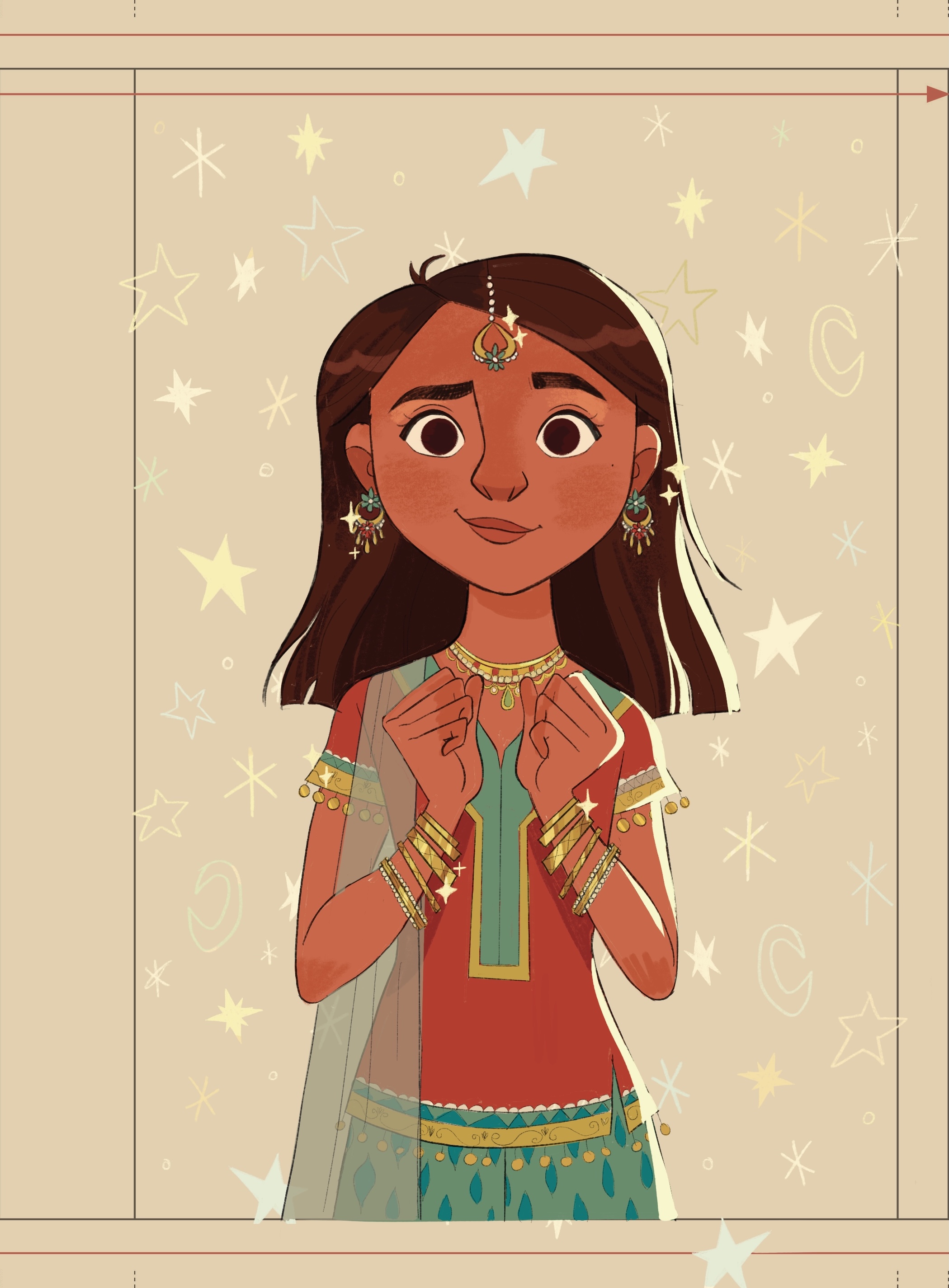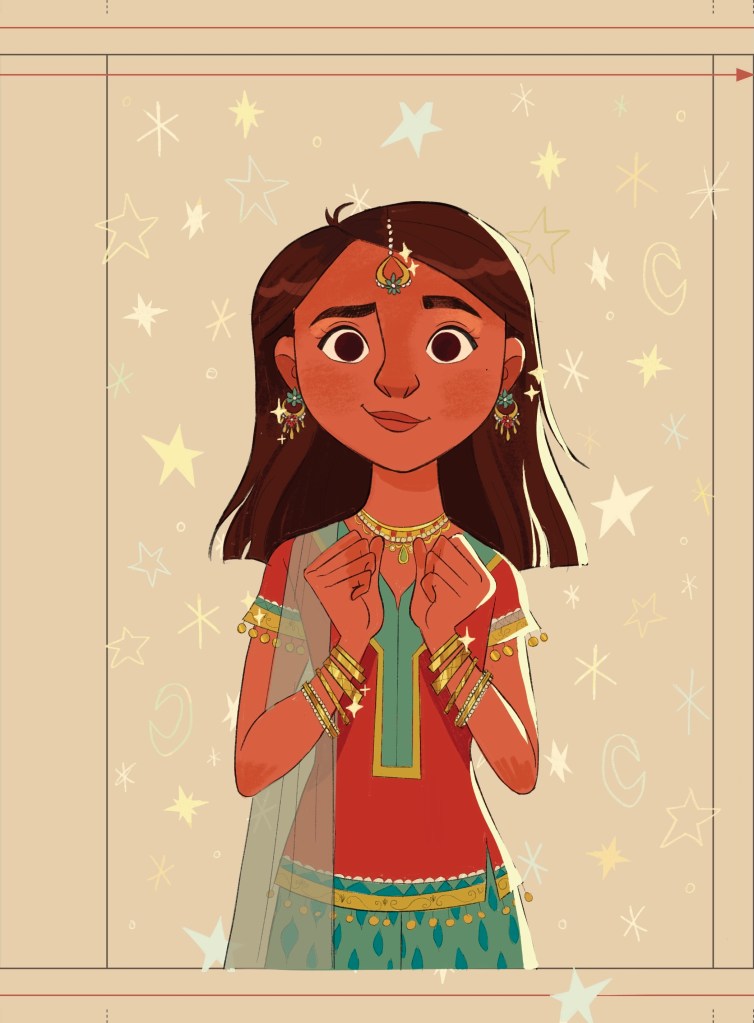 I want people to be intrigued! I designed a girl, decked out in jewels and traditional desi clothing, and she’s very slyly looking over at the viewer like she has a secret. I hope that it gets people curious, and interested in finding out more about her!