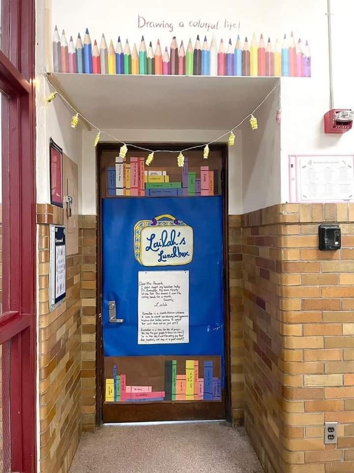 Ms. Maha Almaweri from Salina Intermediate located in Dearborn Michigan decorated doors for Ramadan and for Reading month in March. This picture made my day!